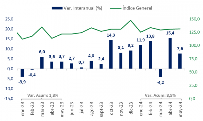 En mayo de 2024, el Estimador de Cifras de Negocios (ECN) exhibió un aumento del 7,6% en comparación con el mismo mes del año anterior. En consecuencia, el crecimiento acumulado al cierre del quinto mes del año asciende a 8,5%, superior al evidenciado en el periodo análogo de 2023 (1,8%).