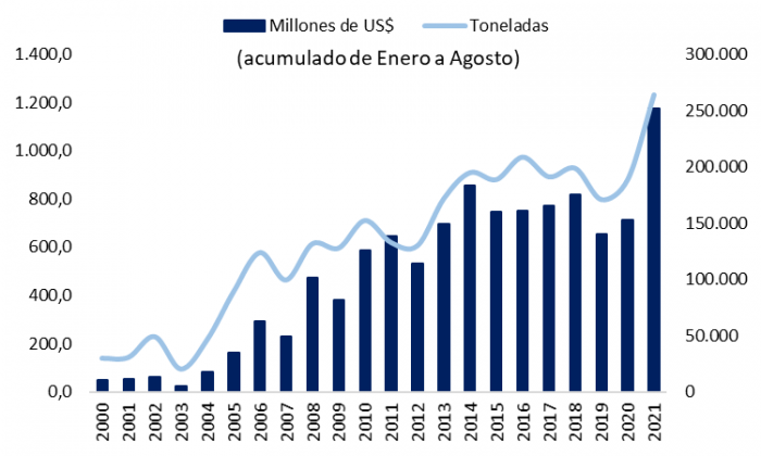 Al cierre de agosto de 2021, las exportaciones de carne bovina totalizaron 1.177,3 millones de dólares, siendo el incremento de casi el 65,0% con relación al año pasado. De este total, en volumen el resultado es de 264 mil toneladas enviadas, 39,9% más que en el 2020.