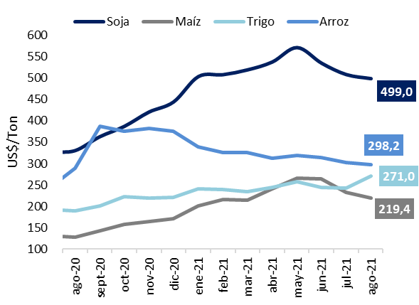 Para la soja, los precios sufrieron varios efectos este mes. Entre ellos se encuentran, la incertidumbre productiva para la nueva campaña 2021/22, por problemas hídricos en los EE. UU., mayor demanda internacional por soja estadounidense, y preocupaciones por nuevos casos de coronavirus en los principales países en el mundo. Así, los precios de la soja para finales de agosto llegaron a su piso, en lo que va del año, ya que se sitúan alrededor de 470,3 US$/ton al 20 de agosto de 2021.