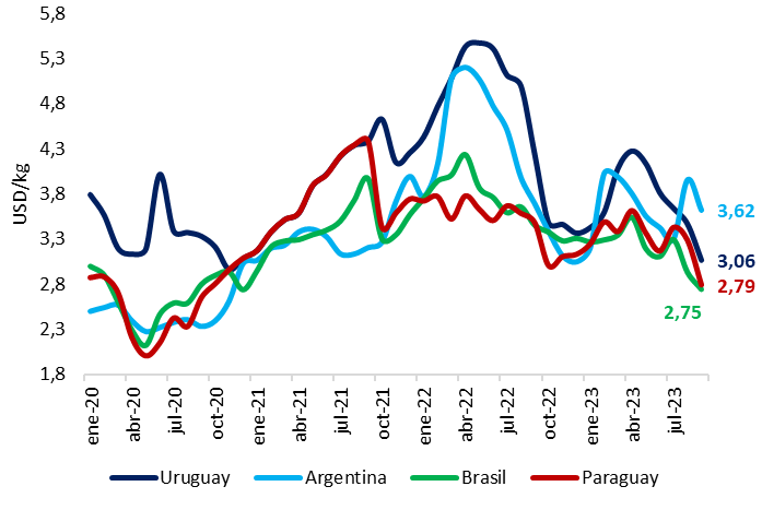 Con relación a los demás países de la región, el novillo para exportación de Uruguay cayó en 11,6%, el de Argentina en 8,5% y el de Brasil en 6,4%, respecto al mes de agosto. En tanto, las variaciones interanuales fueron de -27,7%, -2,0% y -20,5% para Uruguay, Argentina y Brasil, respectivamente.