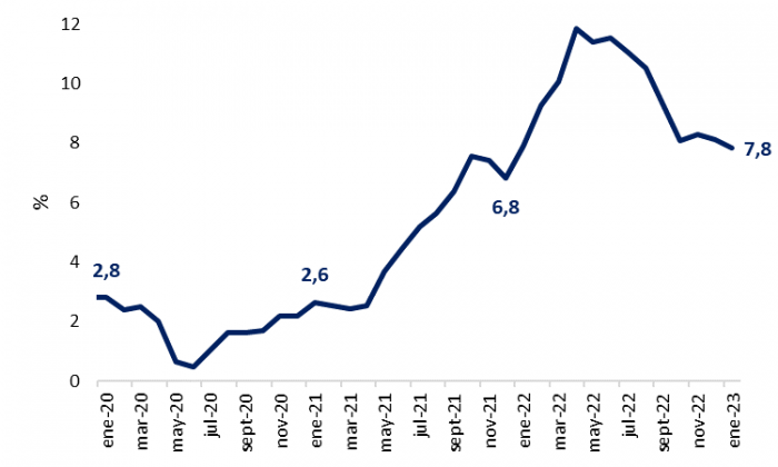 La inflación del primer mes del año llegó a 1,2% intermensual. A pesar de ser elevada, es menor a lo observado en enero de 2022 (1,5%). De esta manera, se registra una inflación interanual de 7,8%, menor a lo registrado en diciembre y enero 2022. El resultado se explica por los incrementos observados en alimentos, combustibles y el servicio de energía. Así también como los bienes duraderos y otros bienes de la canasta.