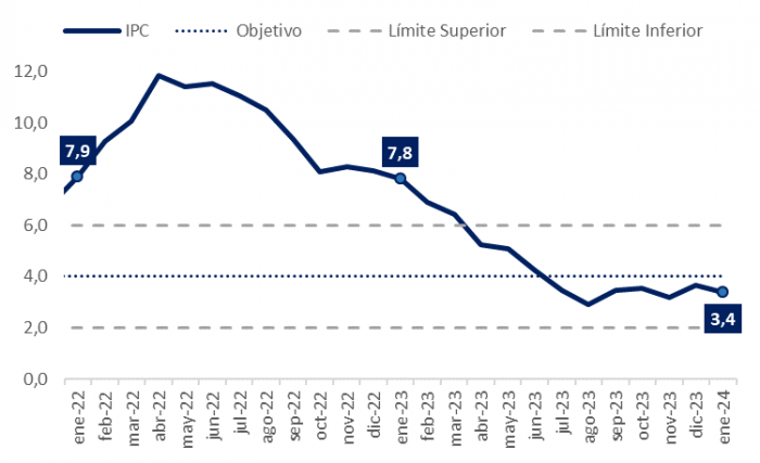 En el primer mes del año 2024, el Índice de Precios al Consumidor (IPC) evidenció una variación mensual del 0,9%, aumentando en comparación con la tasa del 0,3% registrada en diciembre. En cuanto a la variación interanual, se situó en un 3,4%. Con este resultado, se observa el séptimo mes consecutivo con una tasa de variación interanual inferior al 4,0%.