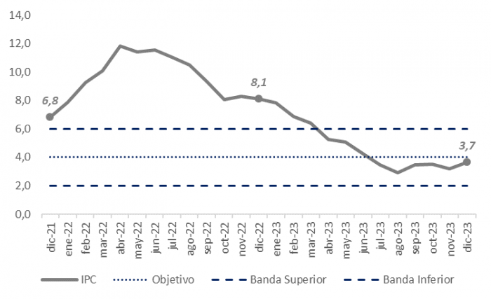 La inflación del mes de diciembre del año 2023, medida por la variación del Índice de Precios al Consumidor (IPC) registró una variación mensual del 0,3%, inferior a la tasa del 0,4% registrada en el mes anterior. Con este resultado, los precios experimentaron un aumento acumulado del 3,7% durante el año 2023, marcando así una notable reducción en comparación con la tasa del 8,1% observada en el año previo, lo que representa una desaceleración inflacionaria.