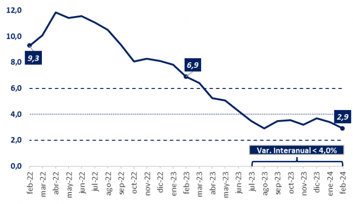 En febrero de 2024, el Índice de Precios al Consumidor (IPC) se mantuvo estable en comparación al mes de enero, en otras palabras, no presentó variación. Por su parte, la inflación interanual se situó en 2,9%, lo que refleja una reducción respecto al 3,4% registrado el mes anterior. Este resultado marca la variación interanual más baja desde agosto de 2023 (2,9%) y representa el octavo mes consecutivo con una tasa de variación inferior al 4,0%.