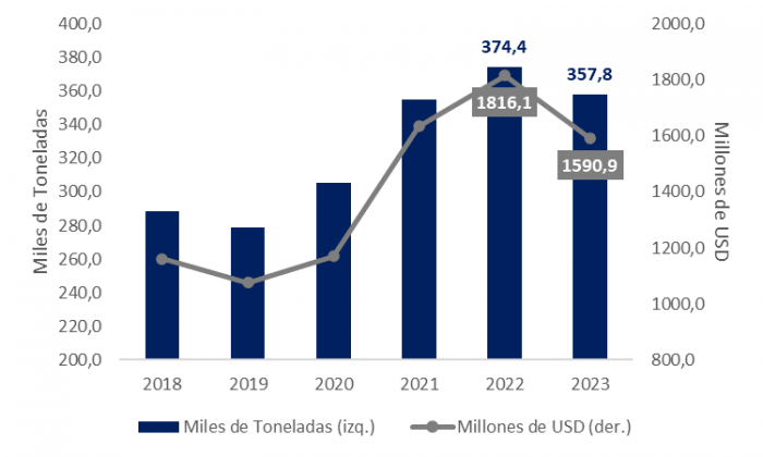 Durante el año 2023, las exportaciones de carne vacuna totalizaron USD 1.590,9 millones, al experimentar una disminución del 12,4% en comparación con el año anterior (USD 1.816,1 millones). En términos de volumen, se exportaron 357,8 miles de toneladas, lo que refleja una reducción de 16,6 miles de toneladas en comparación con el año previo, equivalente a una caída del 4,4%.