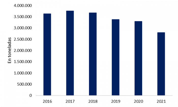 Según los datos de la Cámara Paraguaya de Procesadores de Oleaginosas y Cereales (Cappro), el acumulado del año 2021 fue de 2,79 millones de toneladas, al registrarse una caída de 15,0% con relación al año pasado. Con esta cifra se evidencia el nivel más bajo desde el año 2013.