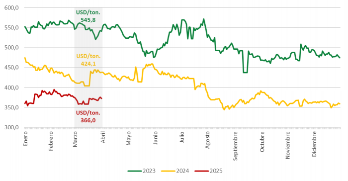 Específicamente, en marzo de 2025, el precio promedio de la oleaginosa se situó en USD 366,0 por tonelada, lo que representa una disminución de 13,7% con respecto al mismo mes del año anterior (USD 424,1 por tonelada). Más aún, en comparación con marzo de 2023 (USD 545,8 por tonelada), la caída fue más pronunciada (32,9%).