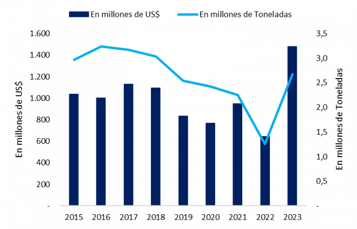 El acumulado de 2023, registra un total de 2,7 millones de toneladas de soja paraguaya enviadas al exterior. Este total enviado representa un incremento del 113,3% con respecto al acumulado del año pasado. Esto se vincula al buen desarrollo de la soja para la campaña 2022/23. Asimismo, en términos monetarios el total asciende a 1.480 millones de dólares, lo cual no se registra un ingreso de esta cifra desde el 2018. De hecho, esto se podría explicar al precio promedio de exportación que se estuvo manejando hasta abril de 2023. El precio estuvo rondando los 552 US$/ton, lo cual posiciona a la cotización a ser la más alta de la historia del país.