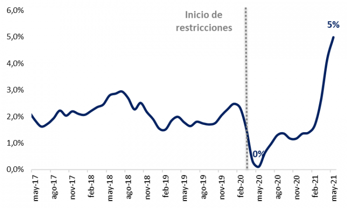 Gracias a las campañas de vacunación y un buen acompañamiento del gobierno americano, la FED prevé mayor crecimiento para los EE.UU. en el 2021, siendo del 7,0%. En cuanto a las variables como el tipo de interés, resolvió mantenerlas, dejándolas dentro del rango de 0% y 0,25%, pese al repunte de la inflación. Este efecto, era esperado por la banca central ya que a medida que la población volviera a sus actividades, llevaría a una intensificación del consumo interno dando espacio a que los precios se vean elevados.