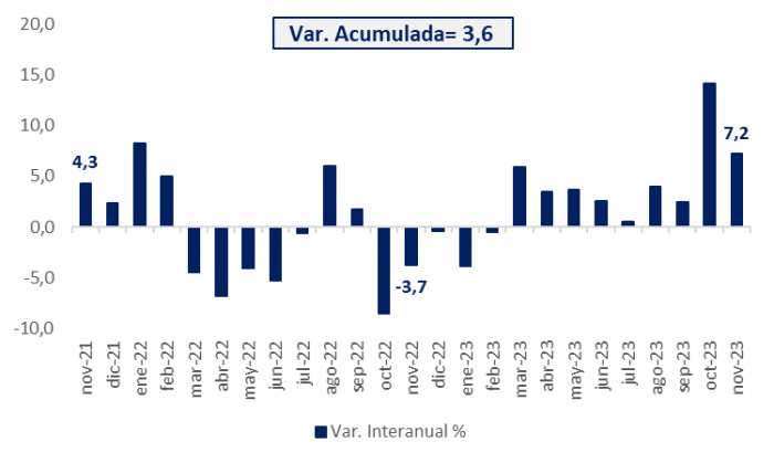 El Estimador de Cifras de Negocios (ECN) evidenció en noviembre de 2023 un aumento del 7,2%, en comparación con el mismo mes del año anterior, cuando este indicador presentó un resultado negativo del 3,7%. Por su parte, la variación acumulada hasta el penúltimo mes del año 2023 se ubicó en 3,6%.