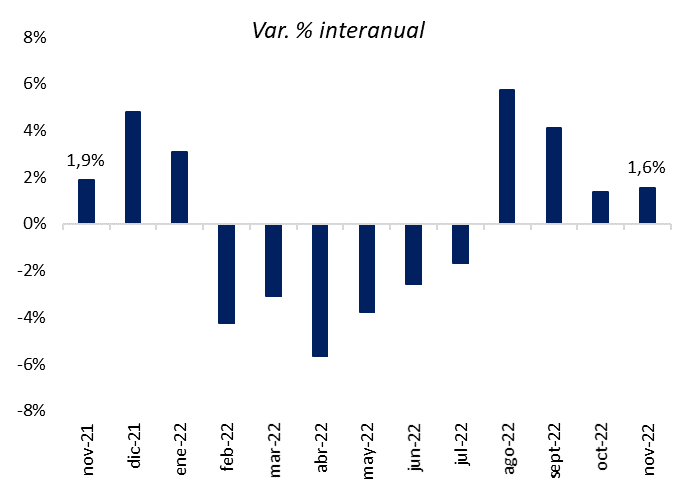 La actividad económica del país ha presentado nuevamente un comportamiento interanual positivo. De acuerdo con los datos del Banco Central del Paraguay (BCP), se observa un crecimiento del 1,6% al décimo primer mes del año. El resultado fue influenciado por los desempeños positivos en agricultura, generación de energía eléctrica y ganadería. Sin embargo, demuestran resultados negativos, los sectores de servicios gubernamentales, telecomunicaciones, de información, de transporte, comercio e intermediación financiera, como también la de construcción.