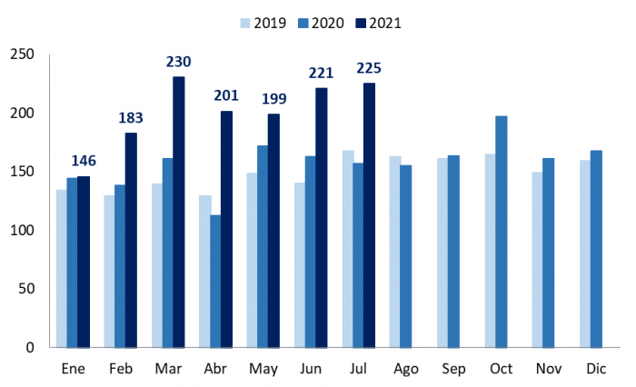 En julio, el total faenado llegó a su segundo mejor mes del año, con un total de 225 cabezas sacrificadas. En este mes, la participación de machos fue de 55% y la de hembras llegó al 45%.