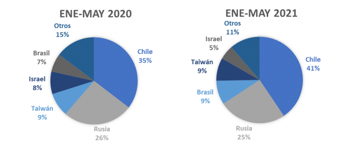La estructura de los principales mercados no ha variado demasiado considerando el periodo de análisis. Sin embargo, se encuentran incrementos relevantes tanto para Chile como para Brasil.