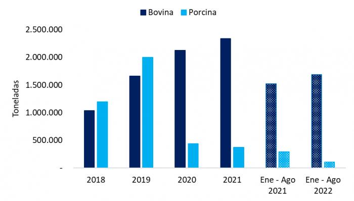 A pesar de que las importantes compras por parte de China, la misma se vio disminuida con relación al año 2021. Al mes de agosto de 2022, el total importado por el país fue de 1,7 millones de toneladas, que representa una importante suba de 11,2% con relación al año pasado. Sin embargo, la importación de este producto se encuentra por debajo del crecimiento registrado entre los años 2019 y 2021. Se prevé que la importación de carne bovina vaya disminuyendo paulatinamente en los próximos años, debido a la preferencia por la carne porcina. Cabe señalar que, la piara de cerdos chinos ha mejorado, al ubicarse en niveles pre-peste porcina.