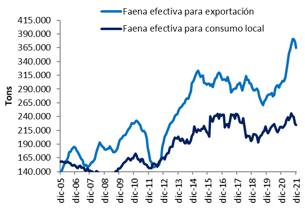 En el año 2021, el comportamiento de la demanda internacional ha generado un buen desempeño de la oferta paraguaya. La faena efectiva para exportación alcanzó un total de 355 mil toneladas enviadas, un 16,4% más con relación al acumulado de diciembre de 2020. Sin embargo, para la faena efectiva destinada al consumo local resultó ser de 193 mil toneladas, con una caída de casi el 10,9% con relación al año pasado.