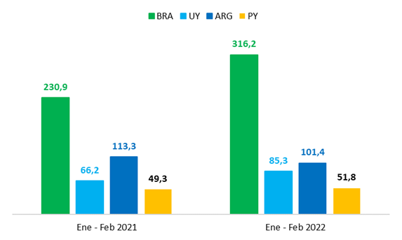 La demanda por carne vacuna ha estado firme. Al mes de febrero 2022, los principales exportadores de carne han enviado a China un total 140 mil toneladas peso carcasa. El principal suplidor es Brasil, que continúa ganando terreno en el mercado asiático.