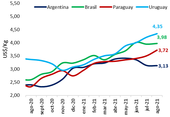 Los precios de la carne vacuna continúan por encima de los 3,0 US$/kg. El promedio a la tercera semana de agosto para el Mercosur fue de 3,89 US$/kg, uno de los precios más altos en el año 2021.