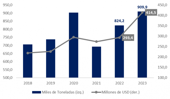 Durante el año 2023, las exportaciones de arroz ascendieron a USD 414,5 millones, evidenciando un aumento del 41,3% respecto al año anterior, que alcanzó los USD 293,4 millones. En cuanto al volumen, se exportaron 909,9 miles de toneladas, representando un incremento del 10,4% en comparación con las 824,2 miles de toneladas del año previo. Estos resultados marcan un hito en las exportaciones de arroz en los últimos años, tanto en términos de volumen como en valores monetarios.