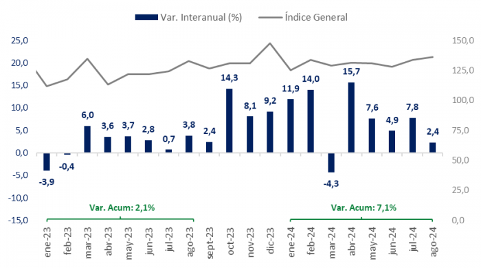 En agosto de 2024, el Estimador de Cifras de Negocios (ECN) mostró un incremento interanual del 2,4%, inferior al 3,8% registrado en el mismo mes del año anterior. Sin embargo, en términos de variación acumulada, el índice presentó un crecimiento del 7,1% al octavo mes de 2024, con lo cual supera al 2,1% alcanzado en lapso análogo de 2023.