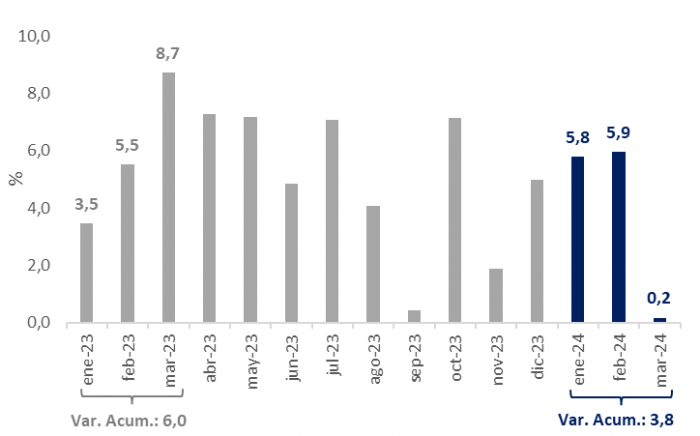 En marzo de 2024, el Indicador Mensual de Actividad Económica del Paraguay (IMAEP) mostró un leve aumento interanual del 0,2%, el más bajo registrado en lo que va del año. Por su parte, la variación acumulada al cierre del primer trimestre se ubicó en 3,8%, cifra inferior a la observada en el periodo análogo de 2023 (6,0%).