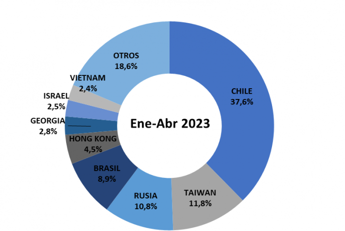 El acumulado a abril de 2023, los envíos al exterior de carne vacuna acumularon un total de US$ 475,6 millones, lo que correspondió a 109,5 miles de toneladas. Las variaciones interanuales fueron de -13,2% y 0,4%, en valor y volumen, respectivamente. Actualmente, las exportaciones a los primeros cinco países fueron rankeadas de la siguiente manera: Chile, Taiwán, Rusia y Brasil. Chile concentró el 37,6% de los envíos (41,2 miles de toneladas), seguido por Taiwán, con una participación de 23,3% (75.249 toneladas) y, finalmente, Brasil con el 11,3% (36.592 toneladas).