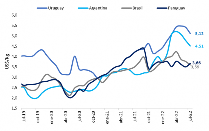 En Brasil el precio promedió 3,6 US$/kg en agosto, menor en 4,5% con relación al año pasado. Para Argentina la cotización llegó a 4,51 US$/kg, con una caída de5,6%. En Uruguay, el precio fue de 5,12 US$/kg lo cual representa una baja mensual de 5,5%. El país que si registro subas mensuales fue Paraguay, el cual llegó a promediar en el mes de agosto 3,7 US$/kg con una variación mensual de 4,7%.