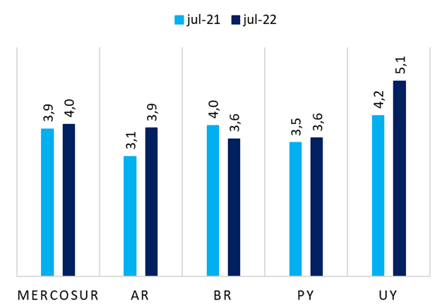 En la última semana de julio, los precios del novillo de Mercosur sufrieron bajas por las referencias en dólares en Argentina y una fuerte contracción en el precio de Paraguay. De esta manera, el precio Mercosur cerró en 3,98 US$/kg, el más bajo en el año 2022.