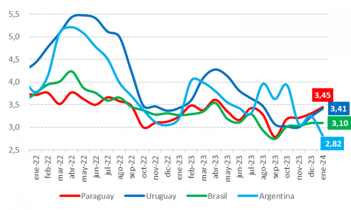 En segundo lugar se encuentra Uruguay, con un precio promedio de USD 3,41 por kilogramo. Cabe destacar que dicho precio presenta variaciones interanuales negativas desde septiembre de 2022. Le sigue Brasil, con un precio promedio de USD 3,10 por kilogramo. En este caso, su variación interanual ha experimentado caídas consecutivas desde noviembre de 2022.