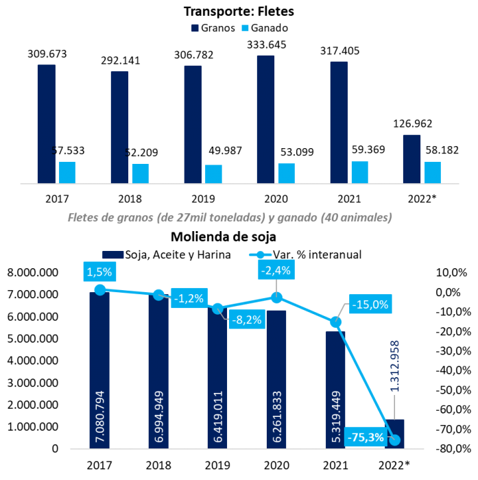 La caída de la producción de soja para la campaña 2021/22 llevaría a diferentes sectores a reducir su desempeño habitual. En el sector de transporte, que es altamente dependiente del sector agrícola, podría llegar a disminuirse en casi 127mil fletes para el 2022, lo cual se traduciría una sobre oferta de transporte y una posible caída en el precio de este sector. Con relación a la molienda de soja, podría llegar a afectar de manera importante a la industria. En años normales, el promedio del total de la producción dedicada a la industria ha sido del 65%, ante la disminución en la producción y a calidad del grano media a baja se podría esperar que aproximadamente solo el 50% de este se utilice para la industrialización, lo que llevaría a una caída estimada de 75,3% para la molienda de soja, aceite y harina.