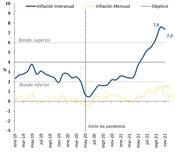 La inflación en el mes de noviembre registró un ascenso mensual de 0,5%, ubicándose la variación acumulada en 6,8%. En cuanto a la variación interanual, la tasa se situó en 7,4%, cifra que continúa por encima de la banda superior del objetivo de metas de inflación.