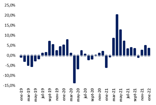 El primer mes del año registró una variación de 3,5% en la actividad económica. Esto como resultado de una mejora en el sector terciario. La flexibilización de las actividades en general ha dado espacio a que los rubros de servicios continúen recuperándose. No obstante, es importante recalcar que, en el mismo mes del año pasado, el mismo indicador presentó una caída de 5,8%, lo cual indica que el incremento observado está por debajo de la caída registrada en el mismo mes del año pasado.