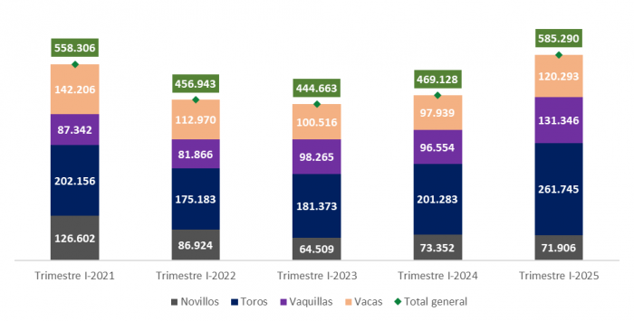 En el desglose por categoría, los toros lideraron la faena del primer trimestre con 261.745 cabezas, lo que representó el 44,7% del total. Les siguieron las vacas y vaquillas, con 131.346 y 120.293 cabezas, que correspondieron al 22,4% y 20,6%, respectivamente. Por su parte, los novillos totalizaron 71.906 animales, con una participación del 12,3%. En términos interanuales, todas las categorías registraron aumentos, a excepción de los novillos, cuya faena fue inferior a la observada en el mismo lapso de 2024.