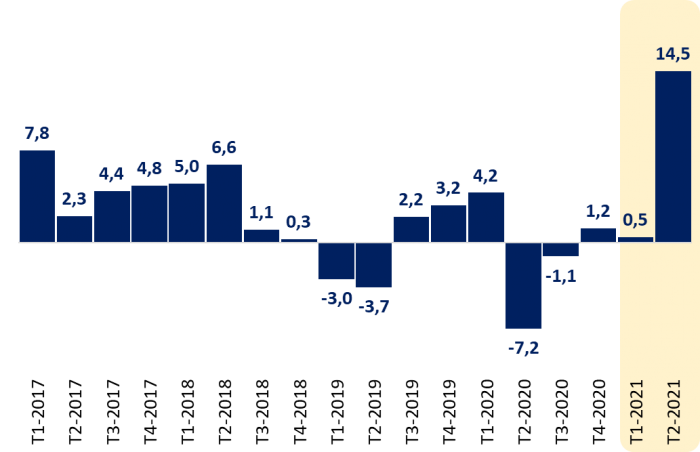 En el segundo trimestre de 2021, la economía paraguaya ha crecido un 14, 5% que al compararlo al mismo periodo del año pasado se nota una recuperación como también un crecimiento de su performance del año pasado. Este escenario obedecía al buen manejo de la vacunación que ha dado su fruto en los sectores más afectados como es el comercio y los servicios, para este caso el mismo arrojó un resultado del orden del 16,3%, lo cual demuestra una se recuperación y un crecimiento importante.
