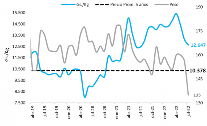 Luego de una sobreoferta que se dio en los meses de mayo y junio, para el séptimo mes del año, los precios mostraron una disminución importante. Al último día de julio los precios rondaron 12.647 US$/Gs el kilogramo, siendo el más bajo en el 2022. La cantidad comercializada ha sido importante en lo que va del año. Los desmamantes machos vendidos durante el primer semestre totalizaron 2.032 cabezas contra 960 registradas el año pasado. Al mismo tiempo, los animales presentaron el peso más bajo, por lo que la compra de animales para invernada se ha dado principalmente con la visión orientada al largo plazo.