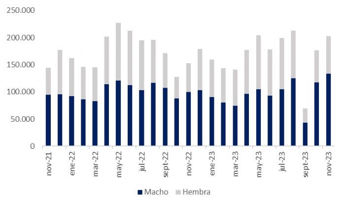 En cuanto a la variación interanual, se registró un incremento del 32,8% en comparación con el mismo mes el año anterior. Sin embargo, al analizar la faena acumulada de enero a noviembre del año 2023, en relación con el año previo, se observa una disminución del 3,9%.