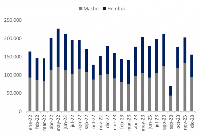 En términos de variación interanual, se observó una reducción del 12,9% en comparación con el mismo mes del año anterior. Además, al analizar la faena acumulada en 2023 con respecto a la del año previo, se registró una disminución del 4,7%.