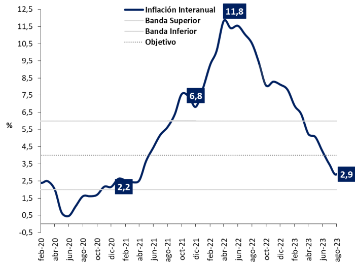 Para el octavo mes del año, el Índice de Precios al Consumidor (IPC) registró una variación mensual negativa de 0,2%, siendo menor a la tasa verificada el mes anterior (0,0%). De esta manera, los precios acumulan un 2,0% en el año, por debajo de la tasa de 7,2% observada en agosto del año pasado. Por su parte, la variación interanual se ubica en 2,9%, tasa inferior al 10,5% verificado en agosto previo, lo que representa una desaceleración inflacionaria.