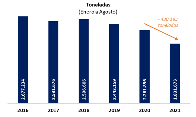 Según la Cámara Paraguaya de Procesadoras de Oleaginosas y Cereales (CAPPRO) la molienda hasta el mes de agosto ha caído en 433 mil toneladas con relación al acumulado a agosto de 2020, siendo el menor valor registrado desde la sequía presentada en el año 2012. De esta manera, agosto se vuelve el tercer mes consecutivo en registrar una caída mensual del procesamiento de la soja. Los problemas que originan esta caída están relacionadas al factor logístico, como la navegación, los cierres de rutas y los problemas que se iniciaron con transportistas que llevó al cierre no programadas de las fábricas.