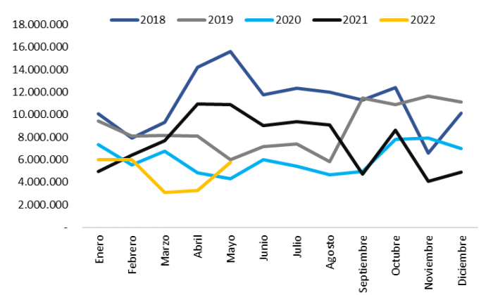 A pesar del desarrollo de la confrontación bélica entre Ucrania y Rusia, continúan los envíos de carne paraguaya a Rusia. Sin embargo, la cantidad ha disminuido notablemente al ser comparada con el mismo mes del año pasado. En marzo, luego del inicio del conflicto bélico, la cantidad enviada bajó casi 60%. En abril la disminución fue de 70% y para mayo fue de 47%. Asimismo, al quinto mes del año, el total enviado a este país se redujo en 24 mil toneladas al comparar con el mismo periodo del año pasado, cuando totalizó unas 41 mil toneladas.