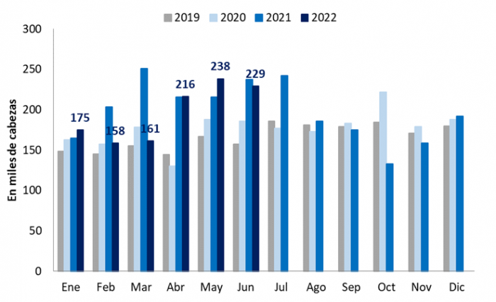 El acumulado de 2022 en faena bovina ha caído sustancialmente en los primeros seis meses. En este caso el total año es de 1,2 cabezas sacrificadas. En junio, la cantidad fue de 229 mil cabezas, menor a lo registrado el mes pasado y 3,5% por debajo de lo faenado en junio 2021.