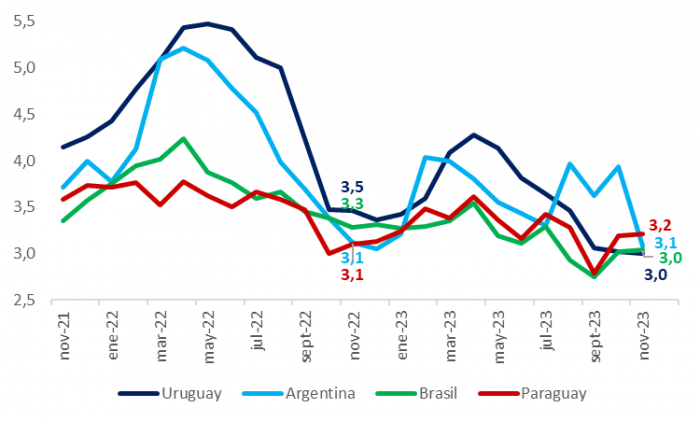 En el undécimo mes del año, el precio promedio del novillo al gancho en Paraguay alcanzó los 3,2 US$/kg, experimentando un aumento del 3,5% en comparación con el mismo mes del año anterior. Destacando aún más, Paraguay lideró la región con el precio promedio más alto en noviembre, superando a países como Argentina (3,1 US$/kg), Brasil (3,0 US$/kg) y Uruguay (3,0 US$/kg).
