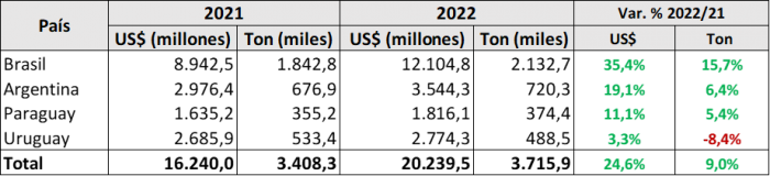 Los datos cerrados para el 2022 son alentadores. Se registro crecimiento para todos los países tanto en divisas percibidas por exportación como volumen enviado. Paraguay, incluso llegó a aumentar en 5,4% el volumen enviado como también los ingresos obtenidos por su producto.