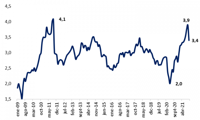 Los precios del gordo tuvieron una retracción en el ultimo mes. A finales de octubre, la cotización promedio un 3,4 US$/kg lo cual representa una bajada de 12,5% intermensual. Esta situación se ve impulsada principalmente por lo que esta ocurriendo en Brasil, donde China, su principal socio comercial, suspendió la compra de su producto por motivos sanitarios. Con esto, la carne del vecino país salió a competir con la paraguaya lo que hace que el precio se vea deprimido.
