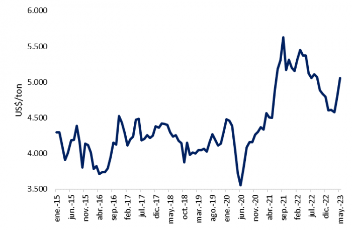 Al cerrar el mes de mayo, los precios de la carne han superado los 5.000 US$/ton. El mes de mayo, el precio fue de 255,2 dólares más con relación a abril, ubicándose en 5.056,5 US$/ton, 5,8% más con respecto a mayo del año pasado. De esta manera, el mercado de la hacienda para exportación sigue la tendencia alcista de precios.