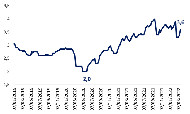 A la última semana de marzo de 2022, la cotización del gordo promedió 3,43 US$/kg, una caída intermensual de 4,0%. Sin embargo, el precio se ve recuperado al ser comparado con el promedio registrado el año pasado, cuando registró un crecimiento del orden del 5,6%.