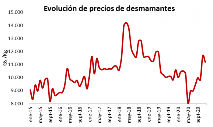 Para los animales destinados al engorde, en el décimo segundo mes del 2020, los precios para los desmamantes machos de hasta 180 kilogramos se encuentran en 10.795 Gs. /kg.