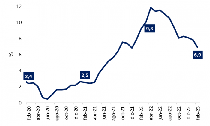 En febrero la inflación llegó a cerrar en 6,9% interanual. Al verificar los precios mensuales, tuvieron un 0,5% lo cual es menor a lo registrado el año pasado durante el mismo mes (1,4%). De esta manera, el acumulado de 2022 llega al 1,7%, siendo por debajo del 2,8% observado durante el mismo periodo del año pasado. El resultado, obedece a, principalmente, a los incrementos registrados en los servicios relacionados a la educación, alimentos y otros servicios de la canasta básica. Por el contrario, las leves disminuciones presentadas se observan a partir del petróleo que lograr atenuar el resultado de febrero.